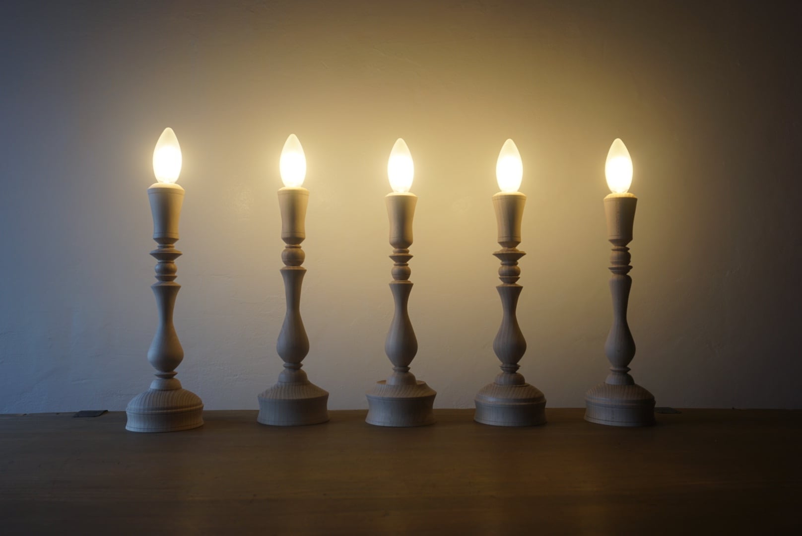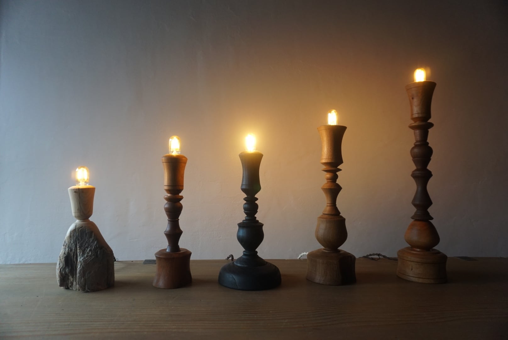 ウッドターニングで仕上げた栗の燭台テーブルランプ。 かつて古民家を支えていた柱材を再生し、栗の木ならではの優しい風合いを活かして手加工で仕上げた一点もののテーブルランプです。 深みある木目と、手仕事が生む滑らかなフォルムが、どこか懐かしくも新しい灯りを演出します。 陶器製のソケットを使用しています。 サイズ 最大径 9.5㎝ 最大高さ 30.5㎝ コード長さ 182㎝ ※発送サイズ80 仕様 コード ホワイトベージュ 電球サイズ E17口金 電球ソケット容量 300V 3A 60Wまで 電球種類 LED ON・OFF スイッチ付き ▶︎電球付属 ▶︎ガラス塗料仕上げ ▶︎ソケット、中間スイッチ、コンセントは安全性を考慮して日本製の純正品を使用しています。 ▶︎できる限り、写真で撮影するようにしておりますが、 写真では撮りきれない、細かな傷、割れなどある場合があります。 ▶︎照明器具の商品は入念な点灯テストを実施し使用に関しての安全は確認しておりますが、 ご使用上のトラブル等は自己責任でお願い致します。 ▶︎また照明器具の木は天然木を乾燥させ削って加工しておりますが、特に無塗装の商品は直射日光を当てると割れの原因になりますので、ご使用場所はその点のご考慮お願いいたします。