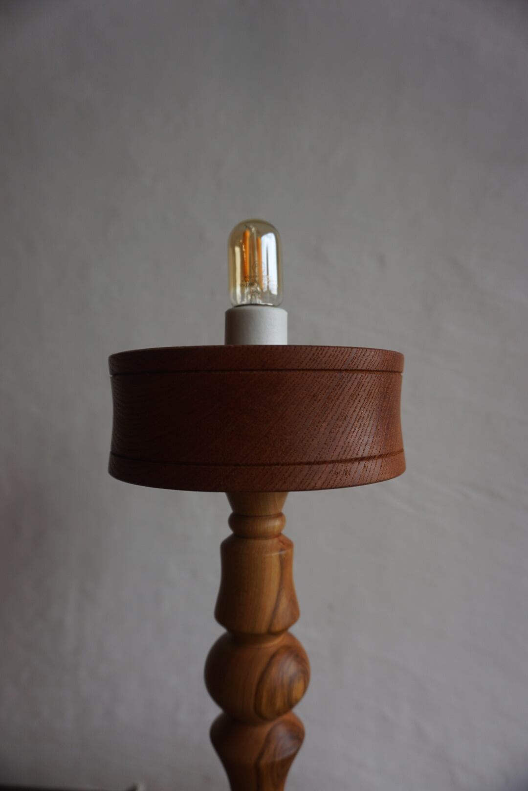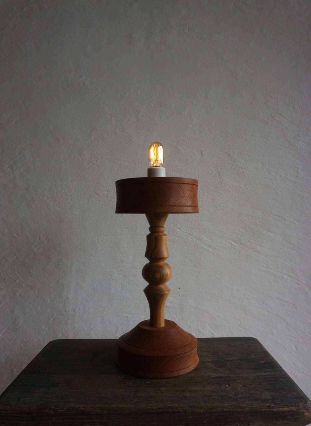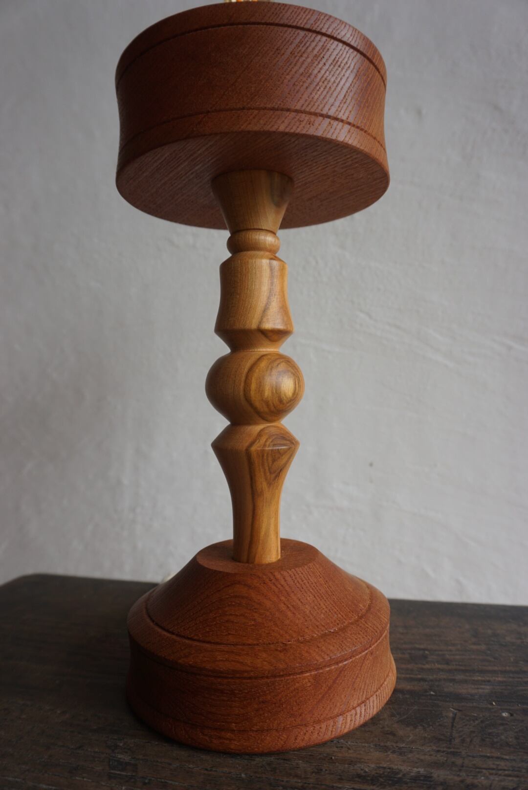 ウッドターニングで仕上げた桜と欅を組み合わせた燭台テーブルランプ。