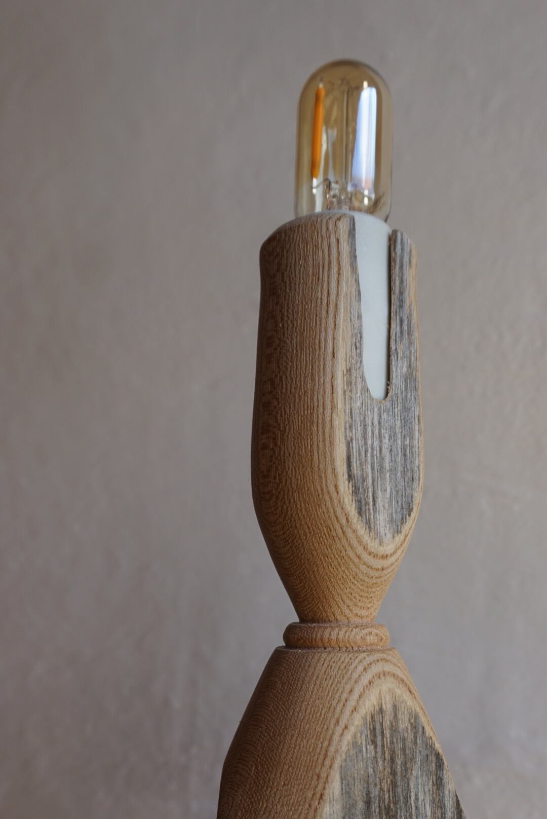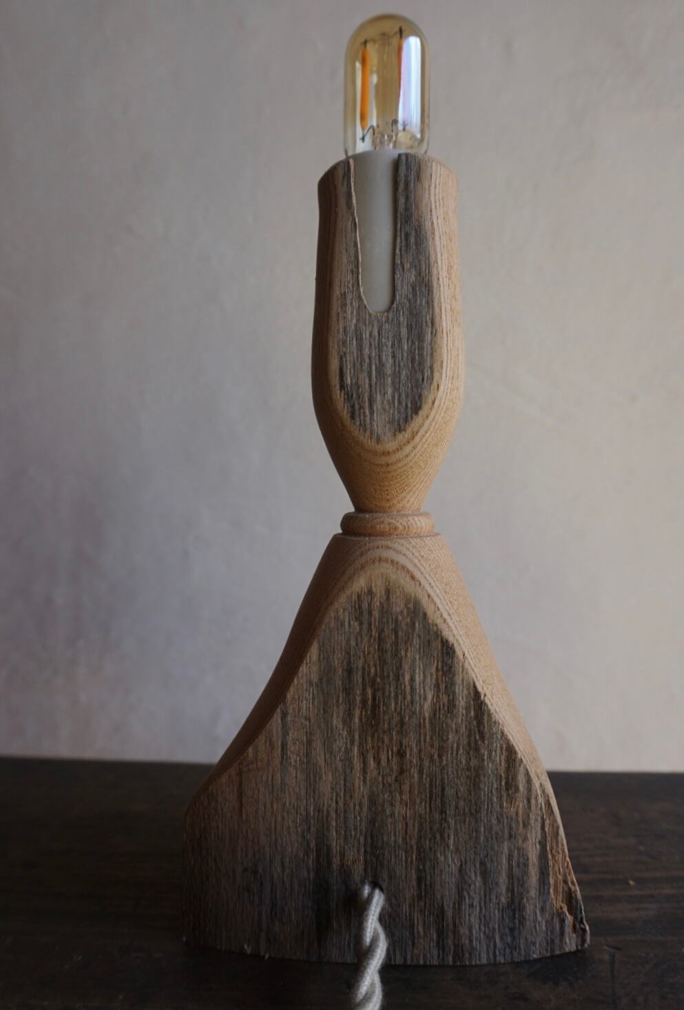 無加工の風合いと、削り出された木目の美しい対比が魅力のテーブルランプ。