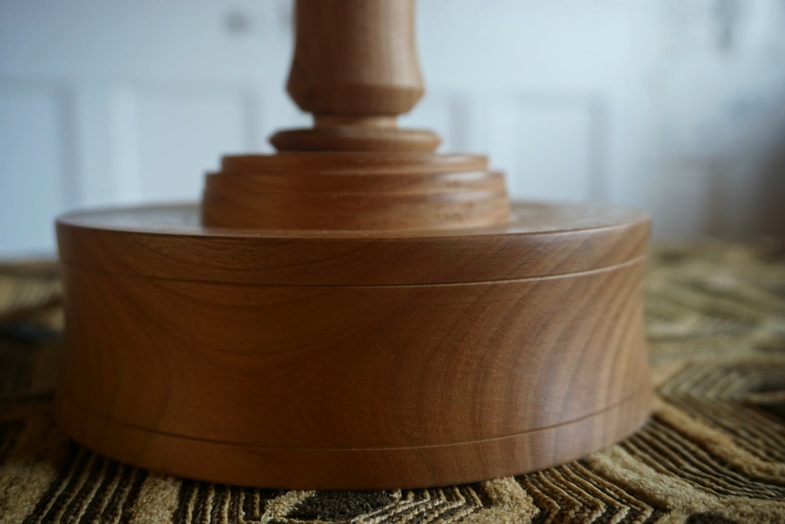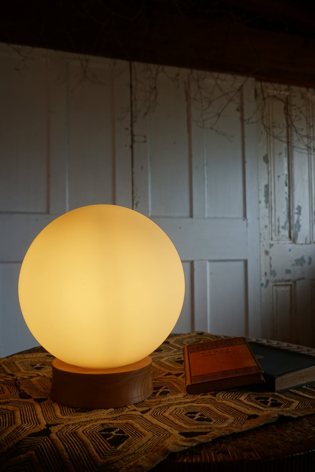 やわらかな乳白色のアンティークガラスシェードに、桜の木をウッドターニングで仕上げた土台を合わせたテーブルランプ。