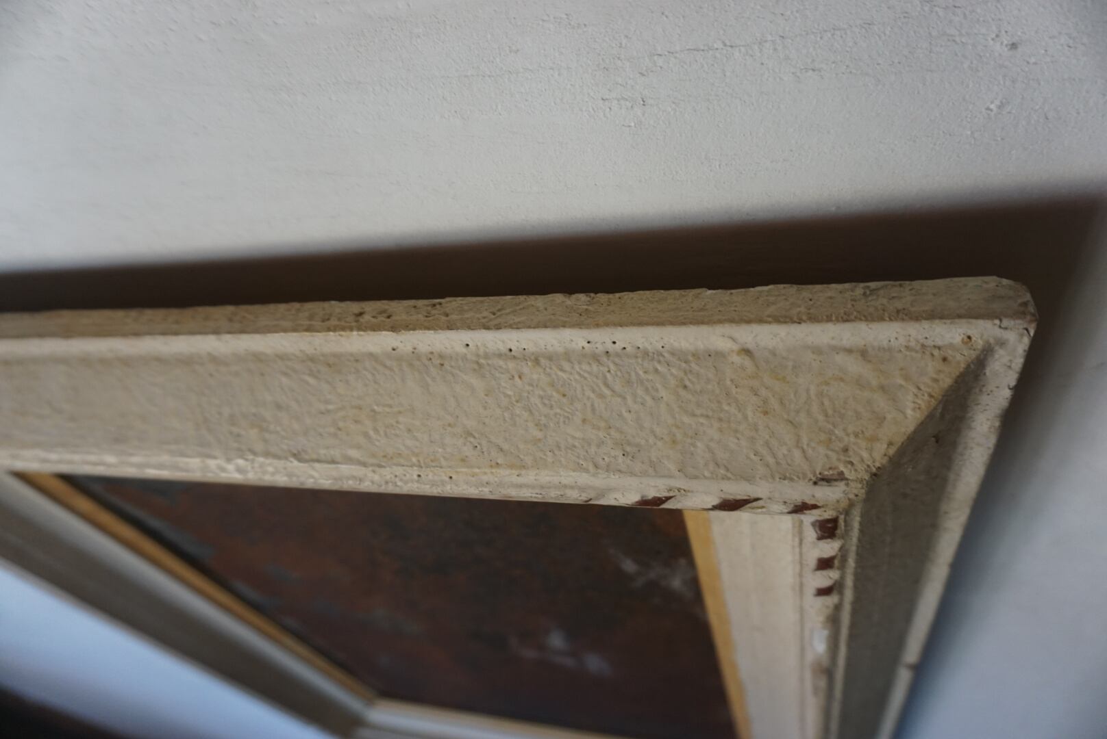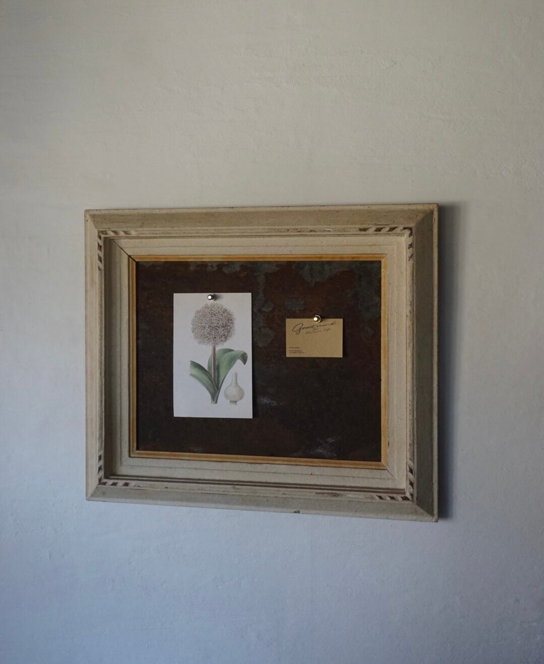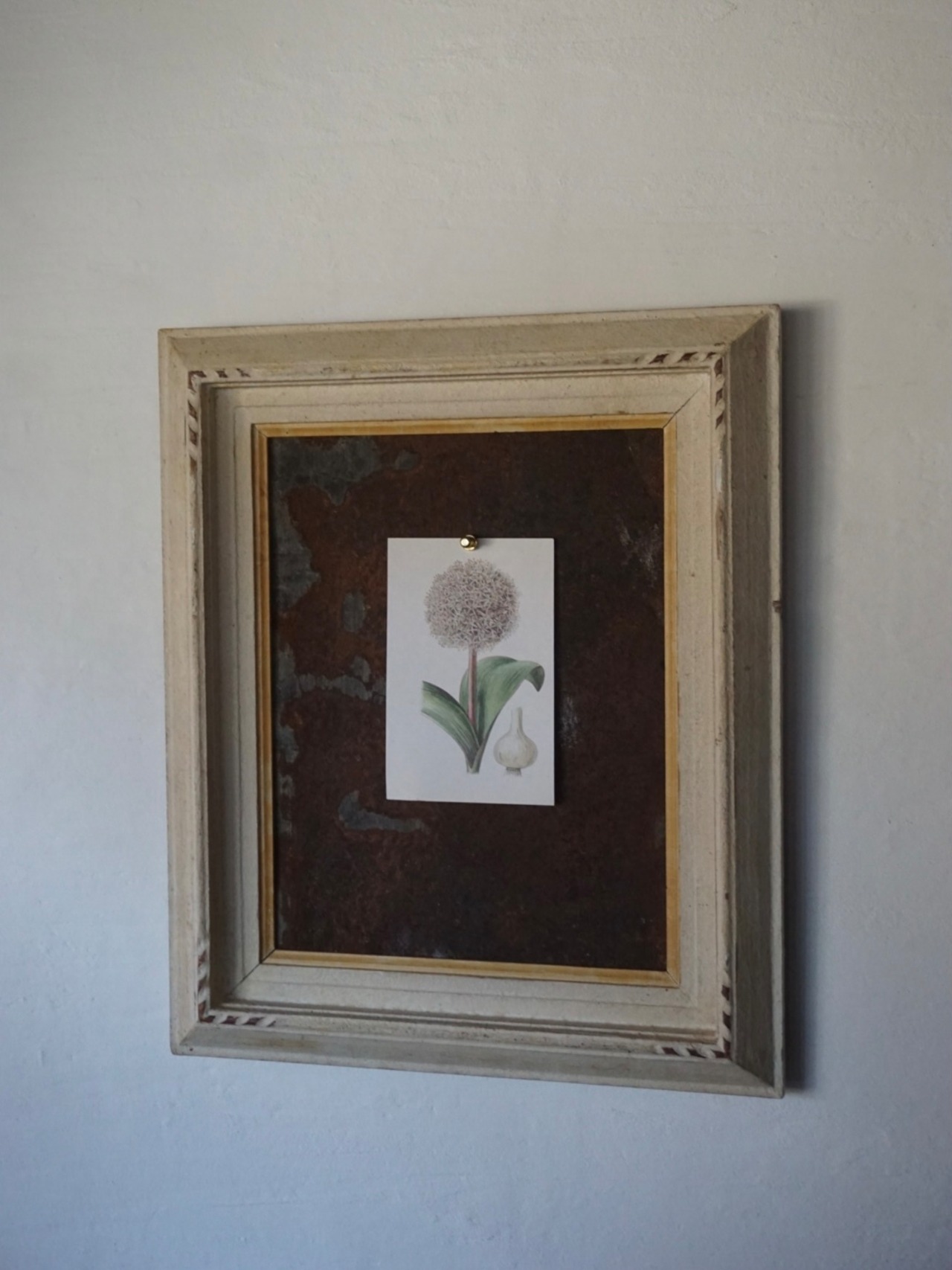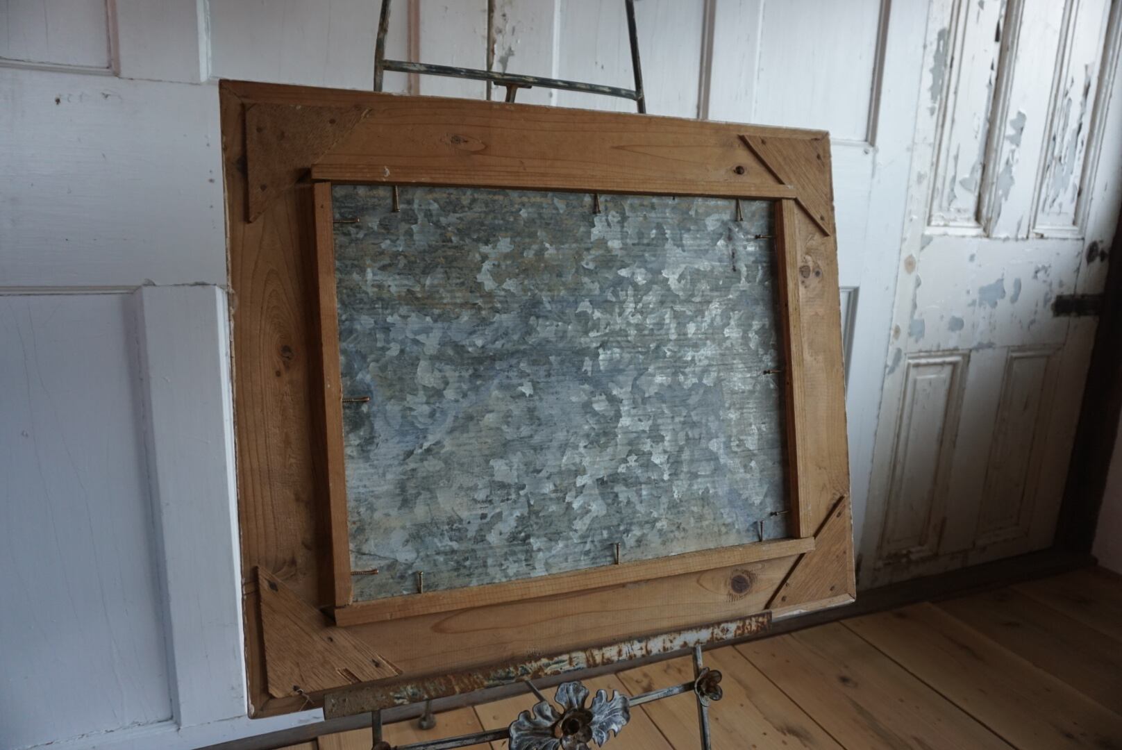 アンティーク額縁と経年変化したブリキ板のサインボードです。