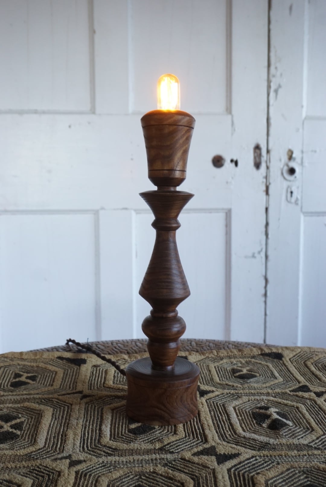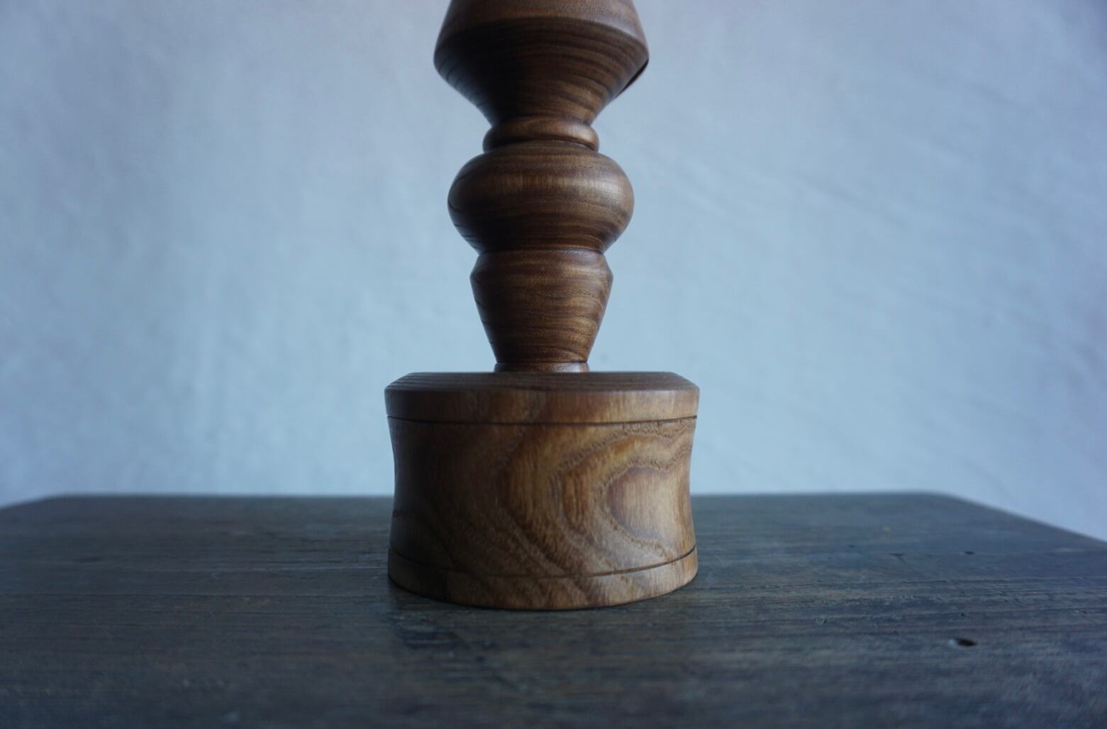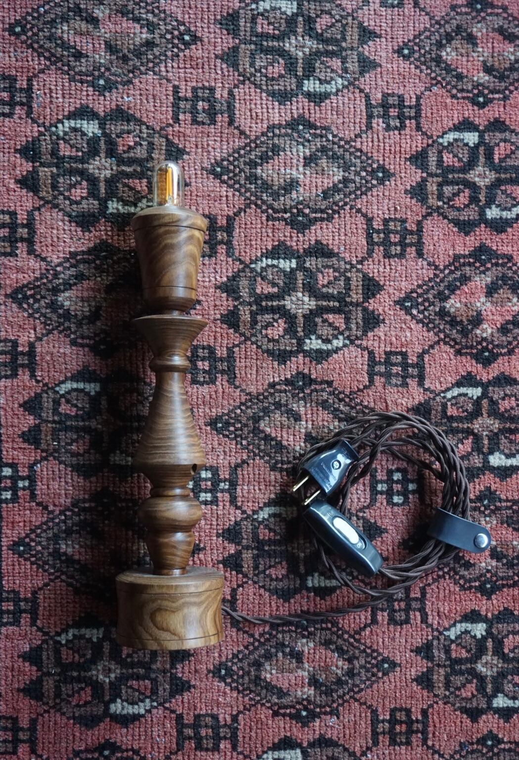 槐の深みある色合いと美しい木目を生かし、一つひとつ丁寧にウッドターニング(ろくろ加工)で削り出した、手仕事ならではの温もりを感じるテーブルランプです。