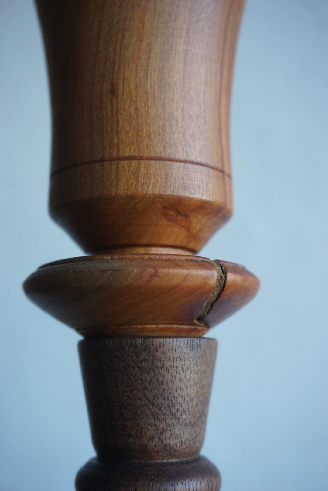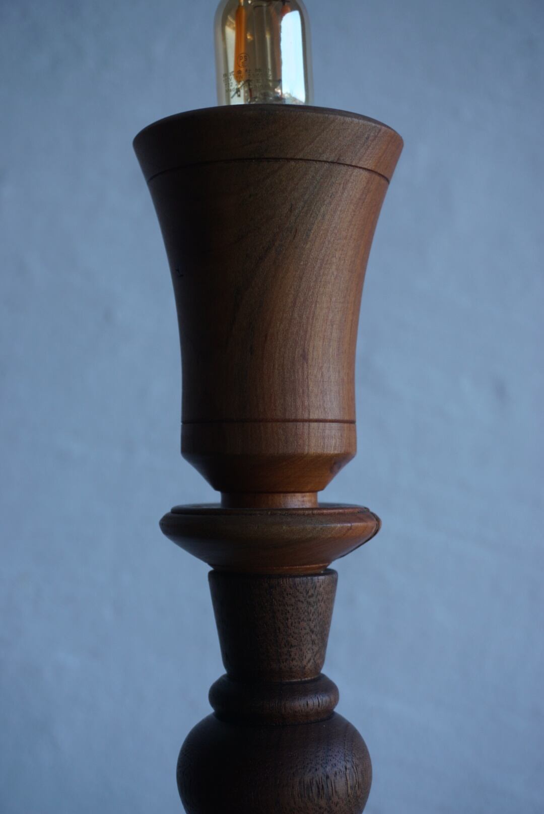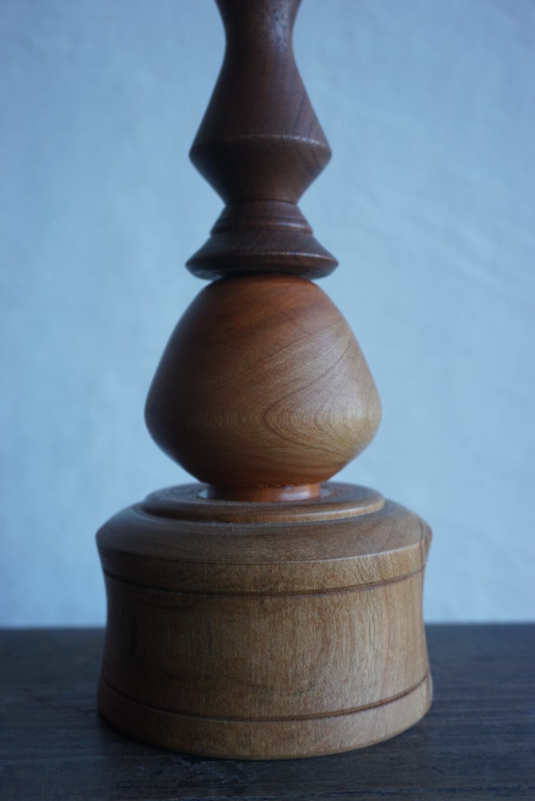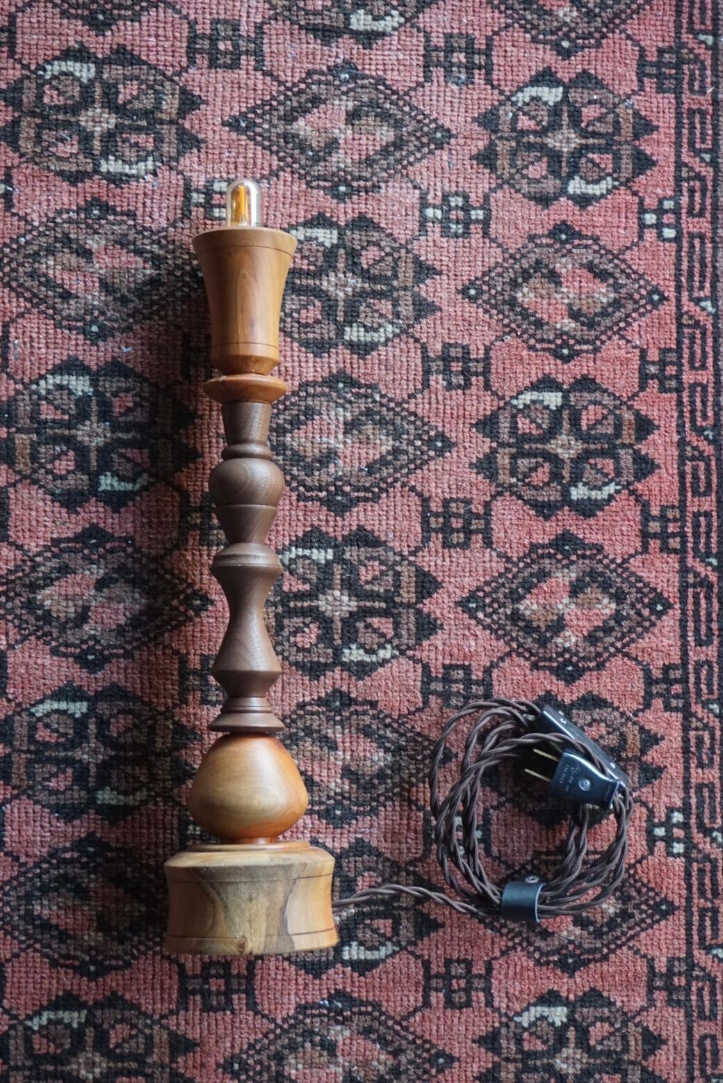 ウッドターニングで仕上げた桜とウォルナットを組み合わせた燭台テーブルランプ。
