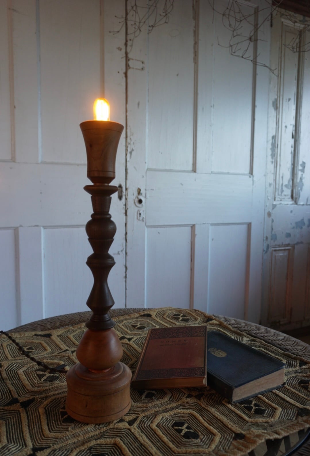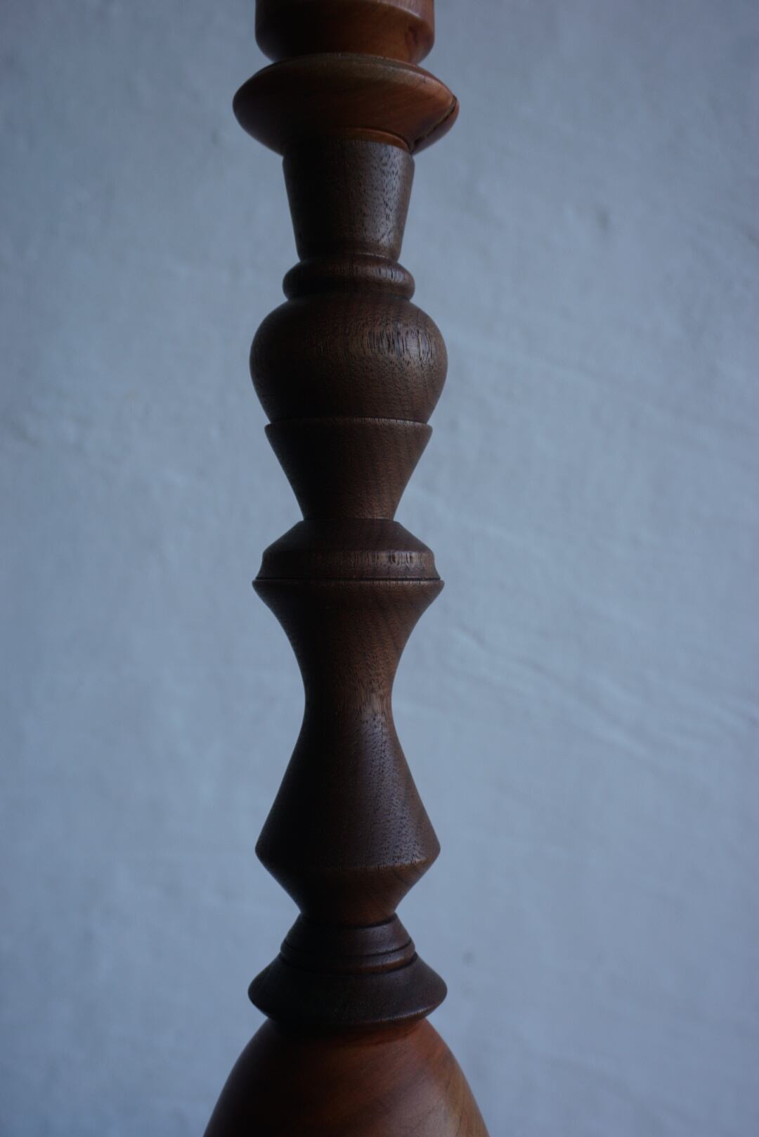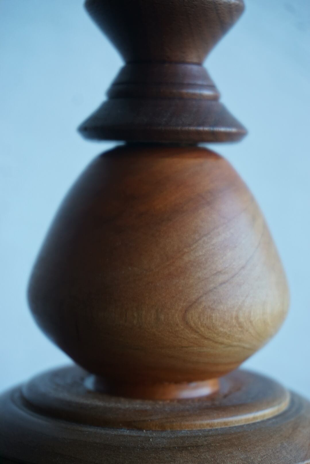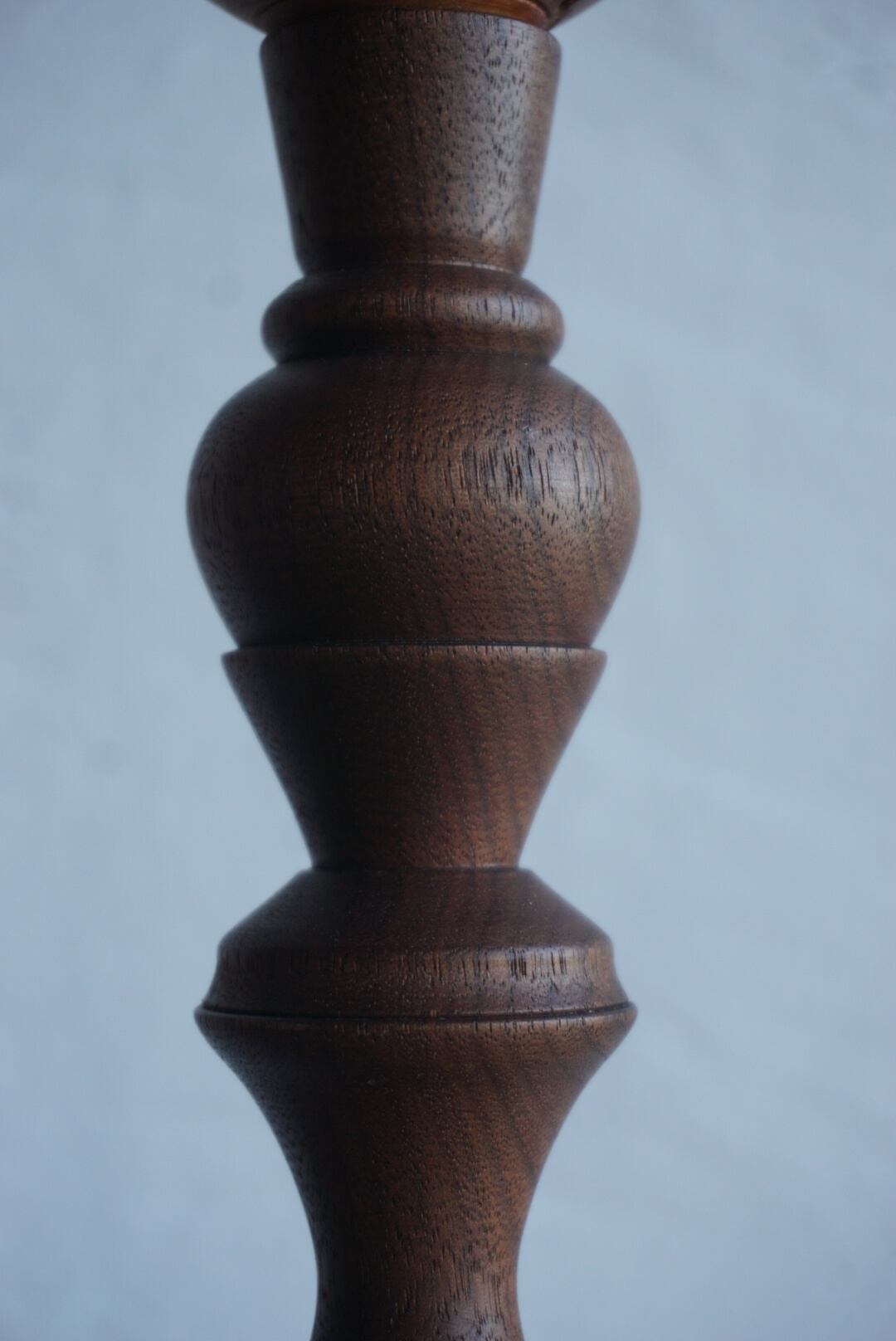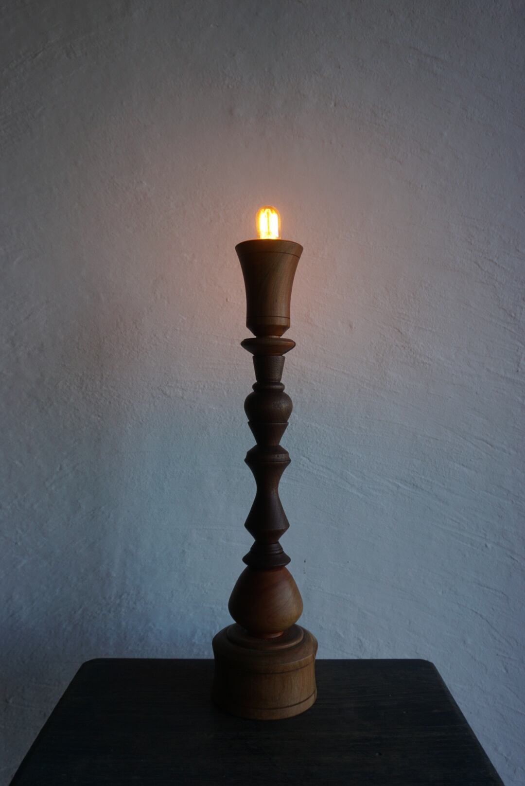 ウッドターニングで仕上げた桜とウォルナットを組み合わせた燭台テーブルランプ。