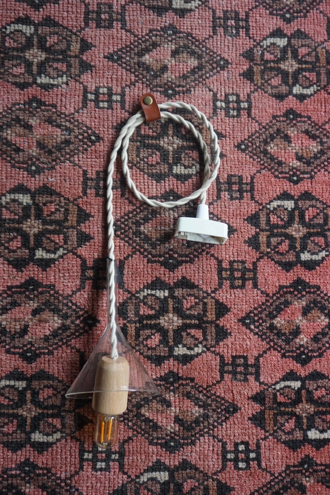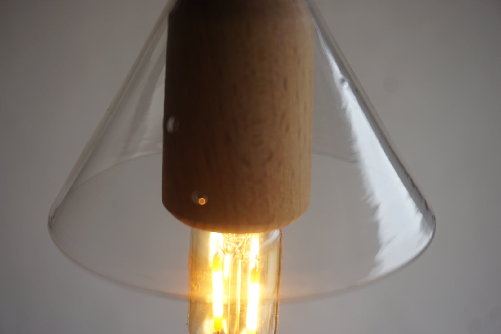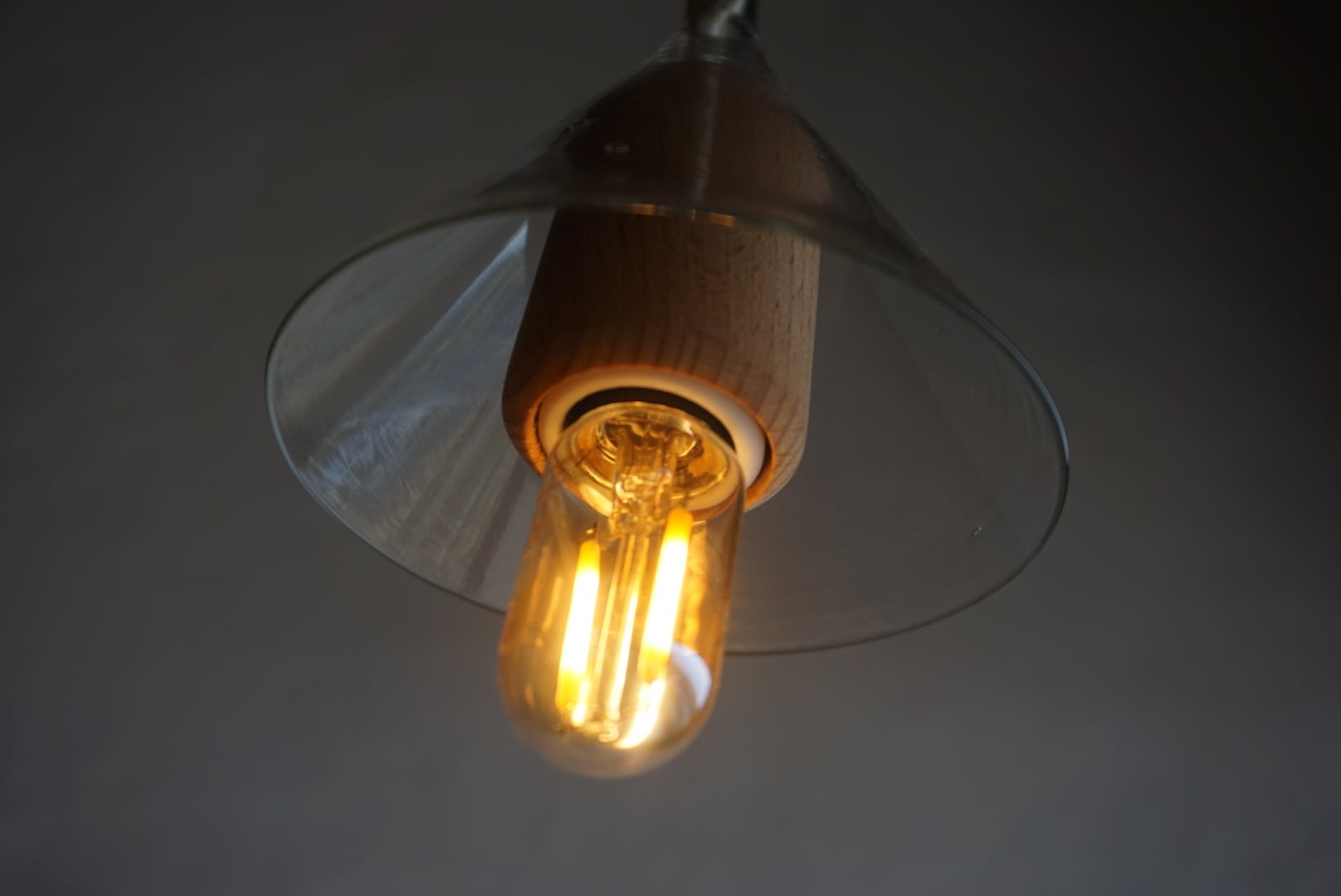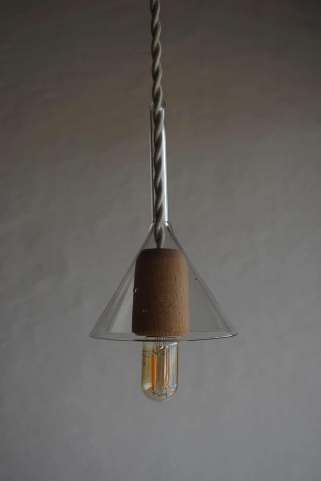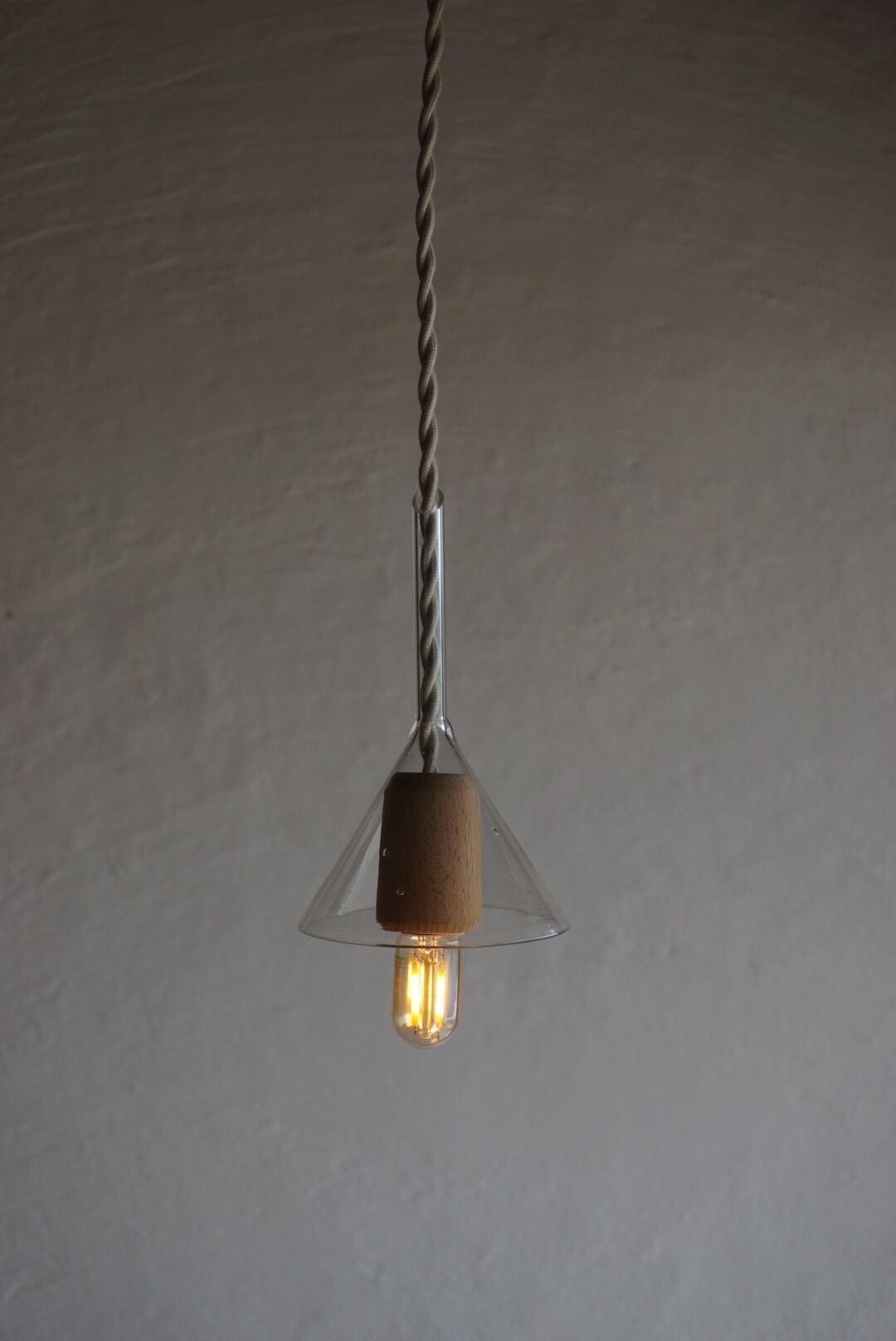 古びたガラス漏斗と木の温もりが調和した一点ものの灯りです。