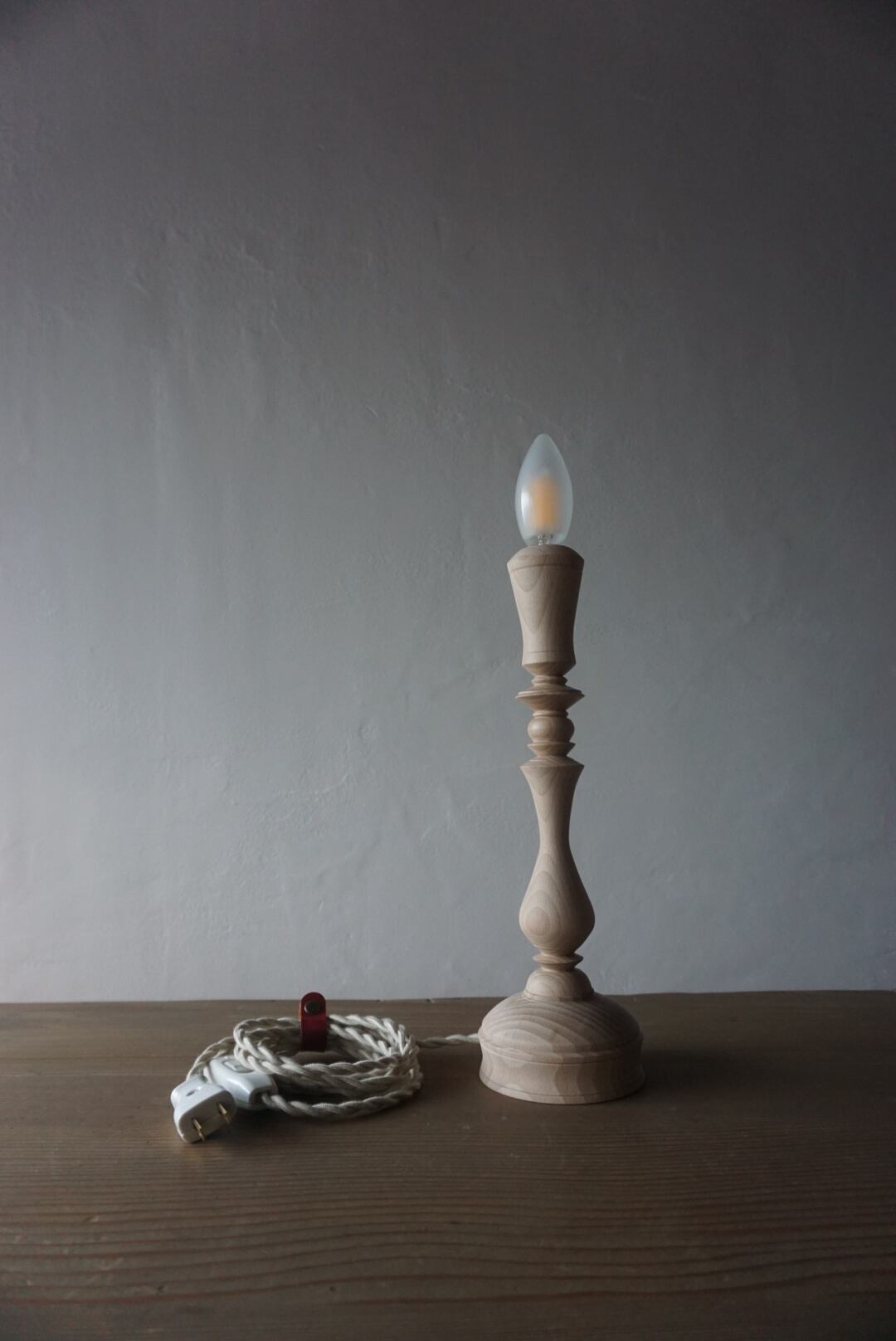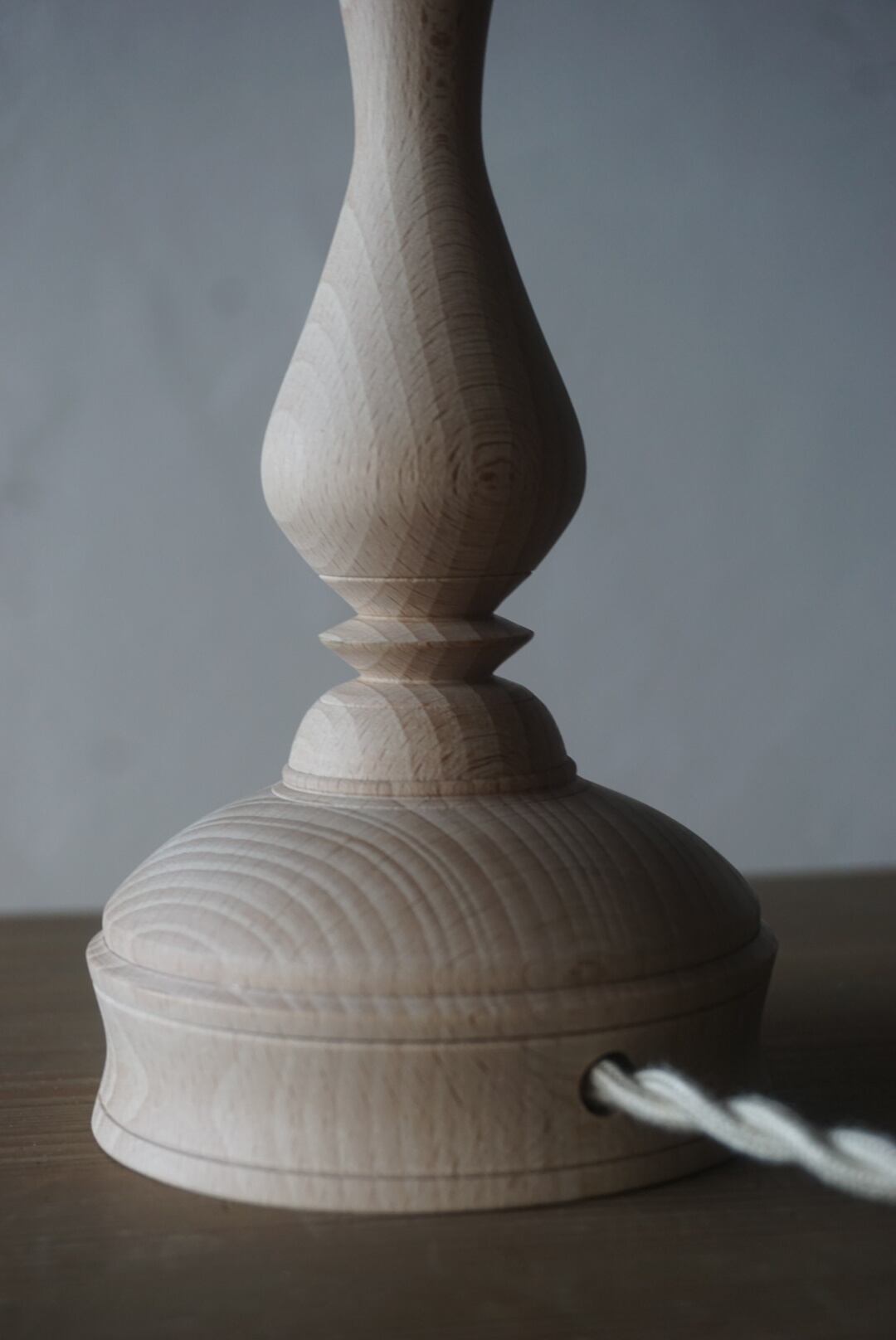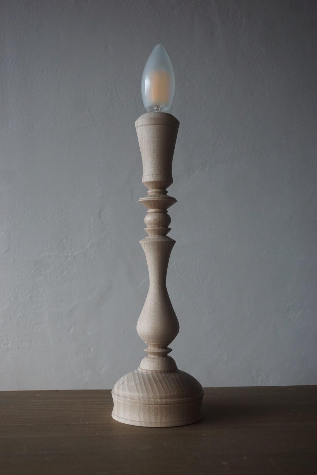 ウッドターニングで仕上げた、ビーチ材の燭台テーブルランプ。