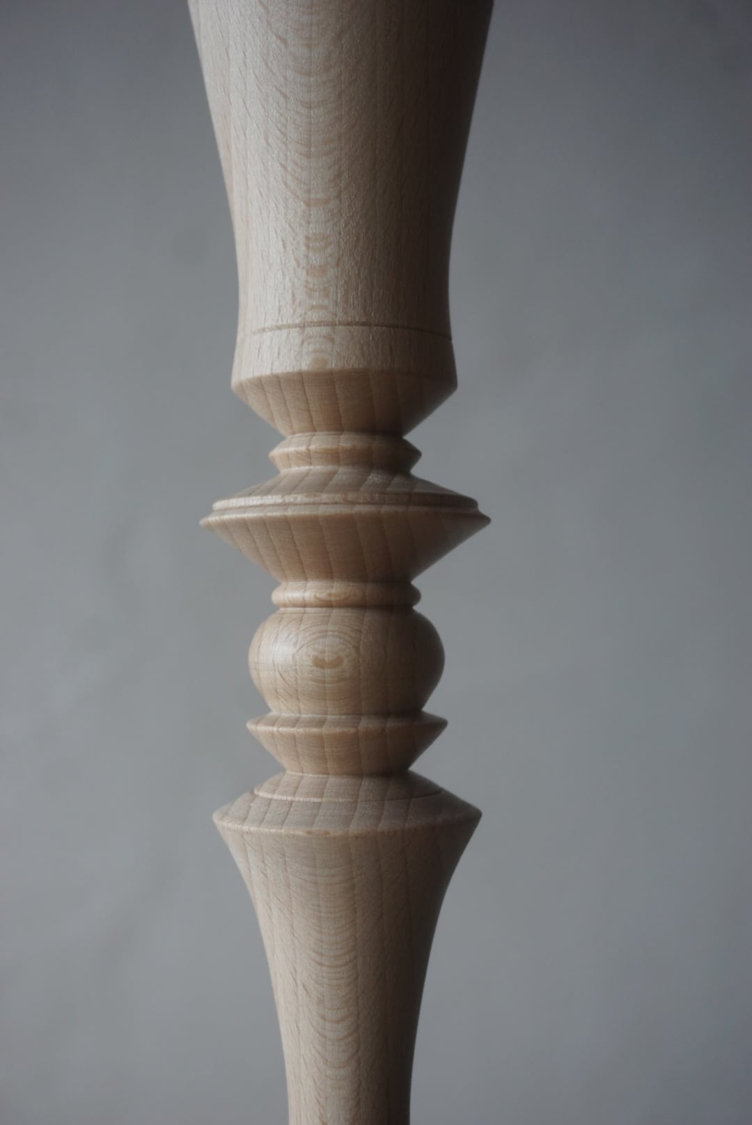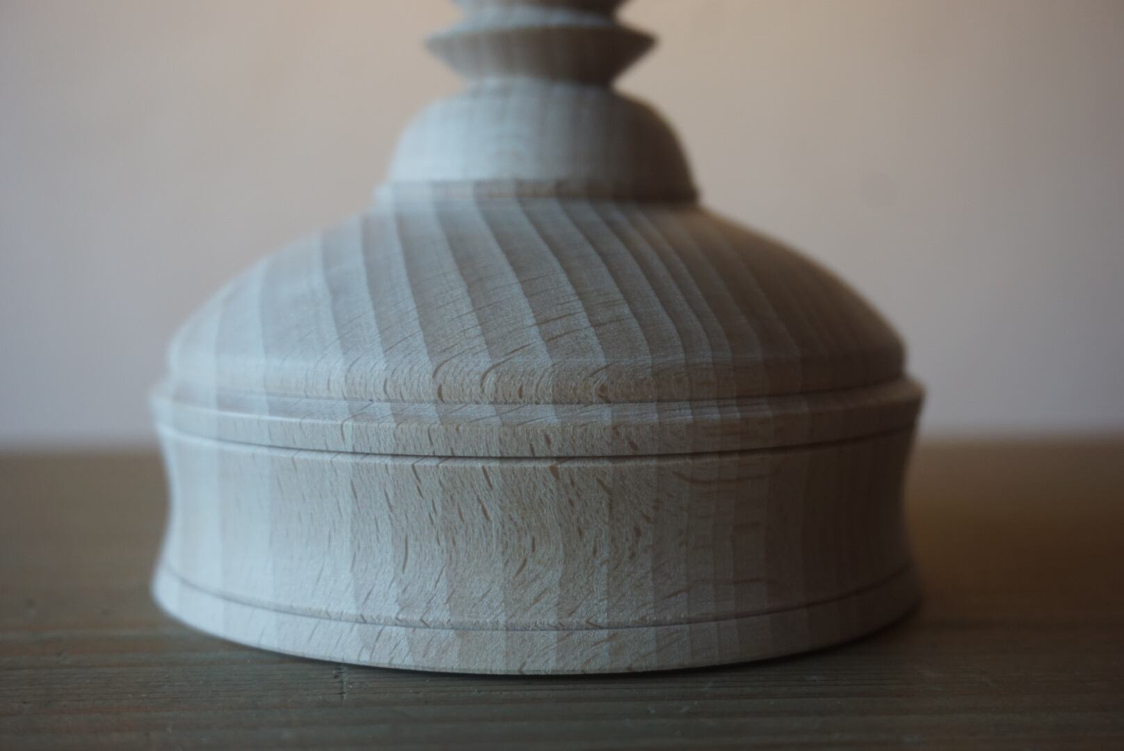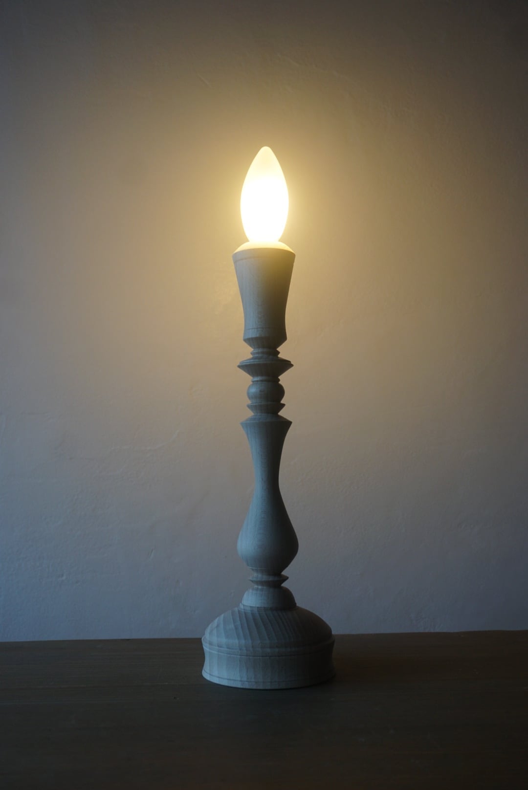 ウッドターニングで仕上げた、ビーチ材の燭台テーブルランプ。