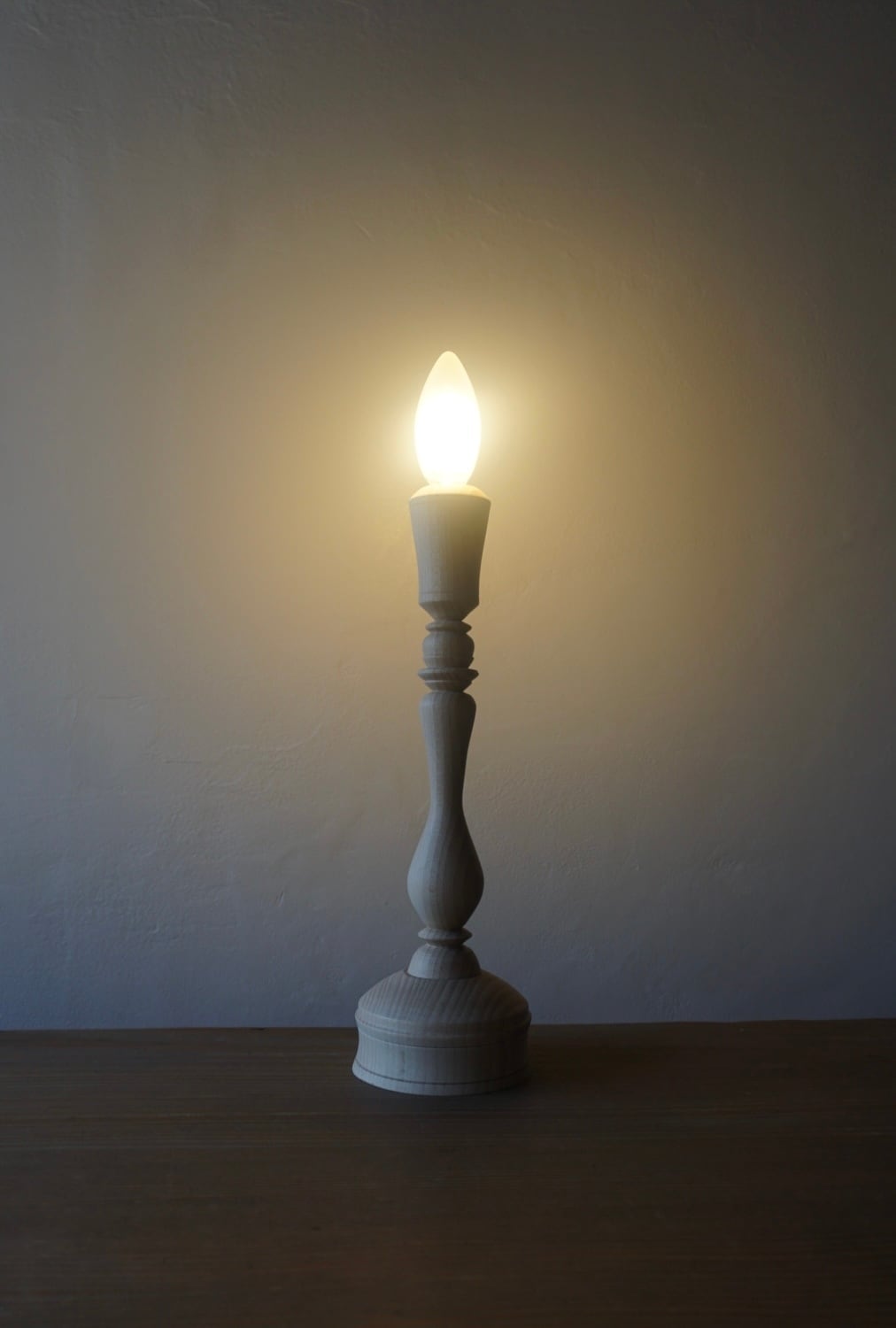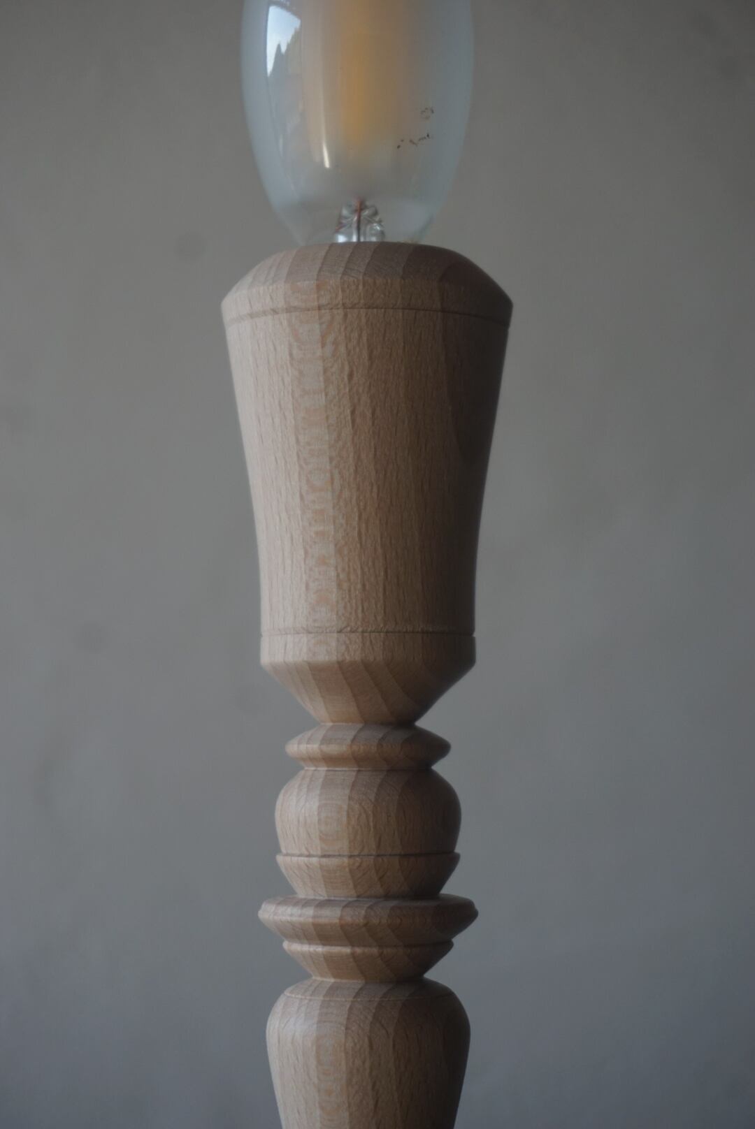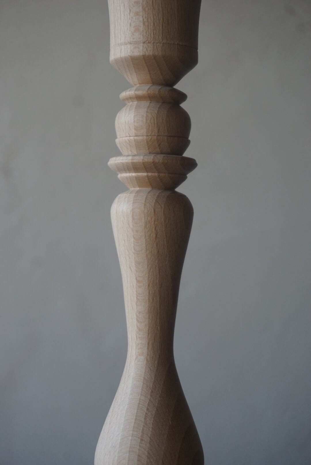 ウッドターニングで仕上げた、ビーチ材の燭台テーブルランプ。