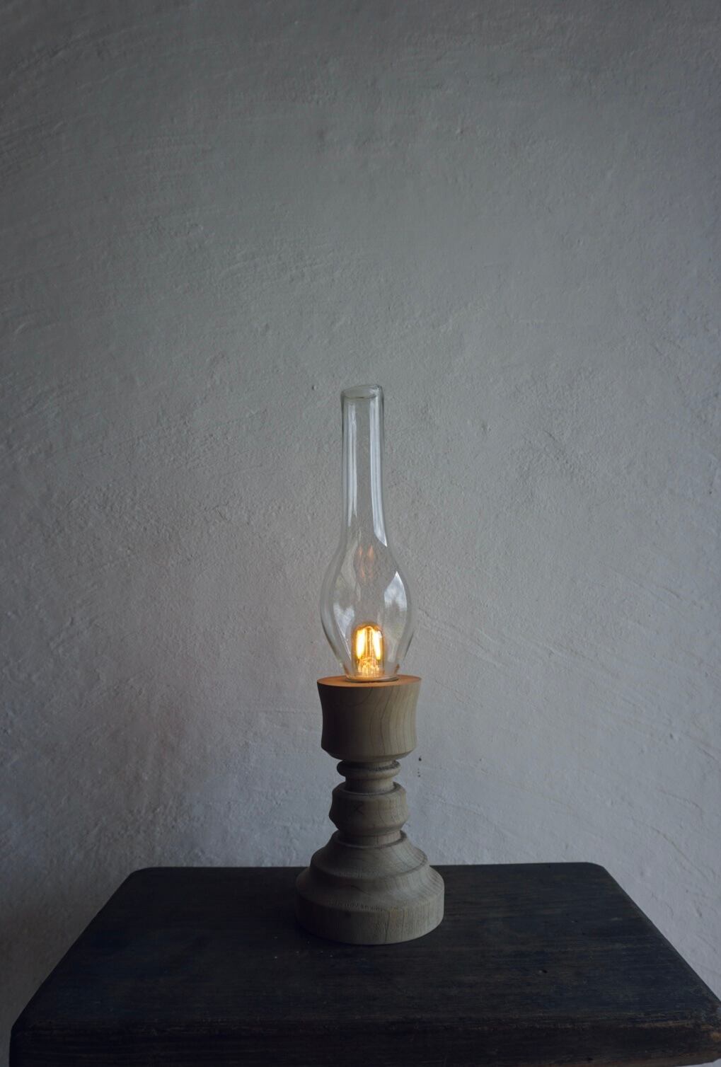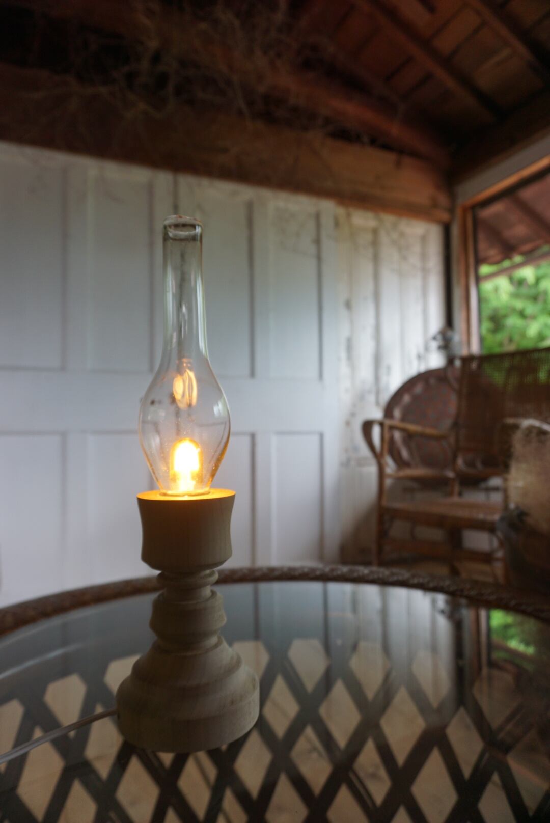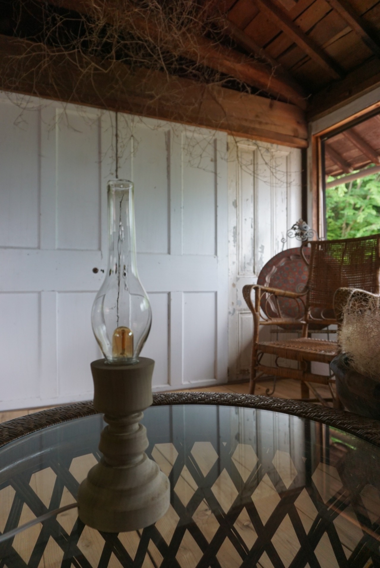 シェードに古道具のオイルランプで使われていたアンティークガラスをかぶせています。